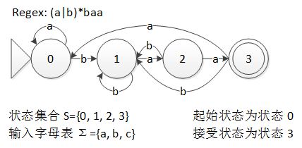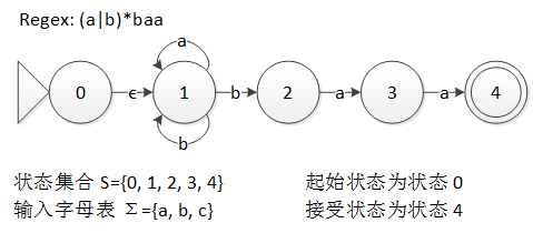 下图就是一个能识别正则表达式 (a|b)*baa 的语言的 NFA,边上的字母就是该边的标号。