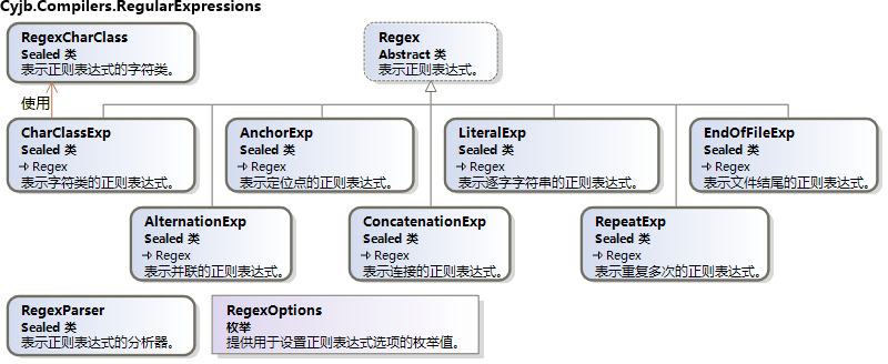 虽然上面定义了正则表达式的规则,但它们表示起来却很简单,我使用 Cyjb.Compilers.RegularExpressions 命名空间下的 8 个类来表示任意的正则表达式,其类图如下所示: