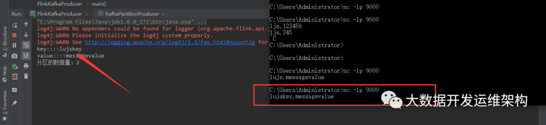 从window命令行,通过socket端9000端口发送数据,主函数接收消息进行处理,然后发送kafka: