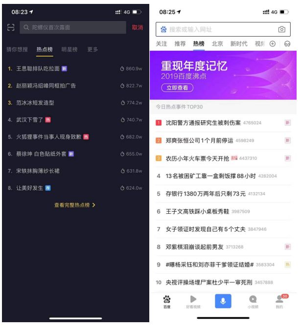 3、最后从平台属性来看,抖音平台提供的基本也都是娱乐信息。比如抖音的热点榜展示的是抖音站内最热话题,而这个热点榜也时常被明星和网红的八卦娱乐内容包围,不仅前面最热的话题是如此,即使拉到10条以后,也依然如是,而在百度热榜中则基本都是新闻以及实时热点,而这也能体现两大媒体平台的属性的差异。
