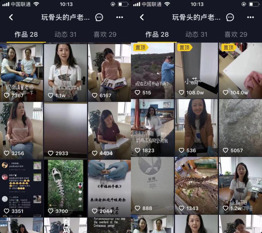 以被官方作为抖音知识大V代表之一的“玩骨头的卢老师”为例,她在“2019DOU知创作者大会”上获得了“抖音最酷科学家”的称号,截至目前为止其账号共有39W粉丝,255.4W点赞,28个作品,其中2个作品获赞过百万,18个作品获赞不过万,剩下的8个作品在1W上下居多,有意思的是获赞最高的两个视频并非知识内容,而是带娱乐反转剧情的知识预告,可见即便拥有众多粉丝,预告也被很多人看见,但到真正讲知识时还有没太多人来观看。