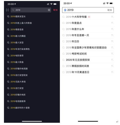 在抖音自称为中国知识普惠平台的一周前,百度也向外界展示了其六大知识产品15年的成绩单,那么不妨用两者来做个对比。以网友通过抖音和百度搜索“2019”一词截图为例,抖音用户搜索显示基本是娱乐化和明星相关的内容,而百度用户搜索显示则更偏向知识和信息的获取,可见抖音用户更希望通过抖音来获取娱乐内容而非知识内容。