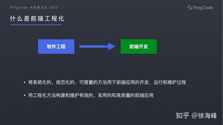 首先前端工程化是把软件工程相关的方法和思想应用到前端开发中。