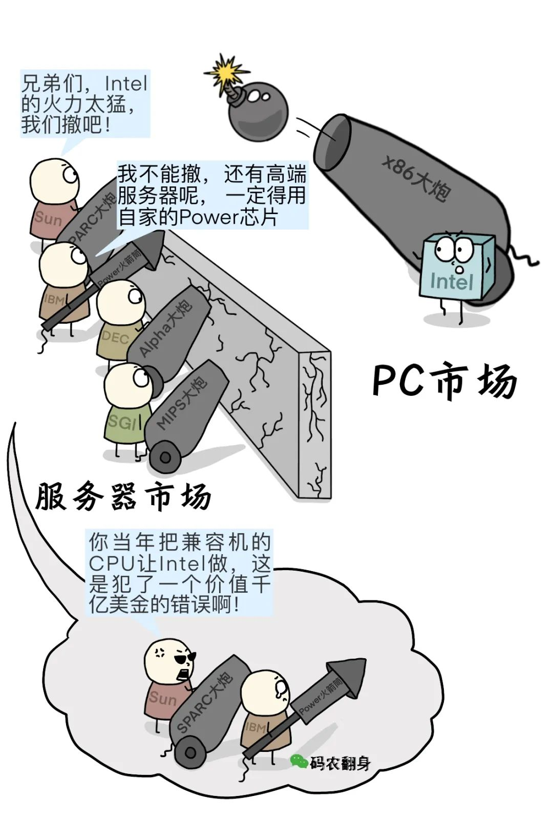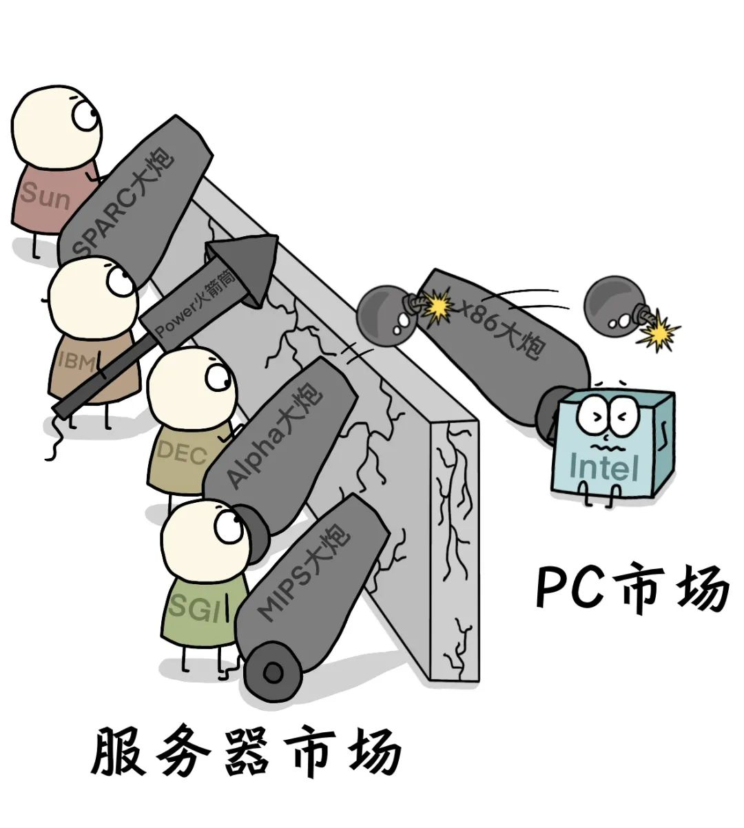 在Intel 的进攻下, RISC在服务器CPU市场节节败退,时至今日,被Intel占据了95%的市场。