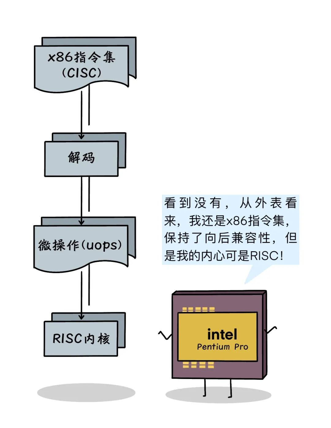 到了1995年,Intel终于找到了办法,那就是把x86的指令集,解码成类似于RISC的微操作(uops),执行的时候采用RISC内核。