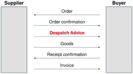采购方使用订单报文(Order)向供应商下订单。供应商发送订单确认报文(Order confirmation)以确认订单中的各类数据。然后,供应商将在装运实际货物之前向买方发送发货通知单报文(Despatch Advice)。这将通知采购方有关货物的基本信息、数量和交货时间等信息,使采购方能够准备入库物流。货物将在发送发货通知单报文(Despatch Advice)发送之后被实际发出。采购方可以选择使用收货确认报文(Receipt confirmation)确认收货。最后一步是提交发票报文(Invoice)。