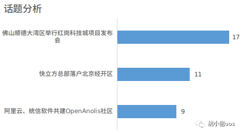 话题方面,内容聚类显示,1月25日~31日,舆论聚焦的信创话题包括“佛山顺德大湾区举行红岗科技城项目发布会”、“快立方总部落户北京经开区”和“阿里云、统信软件共建OpenAnolis社区”。