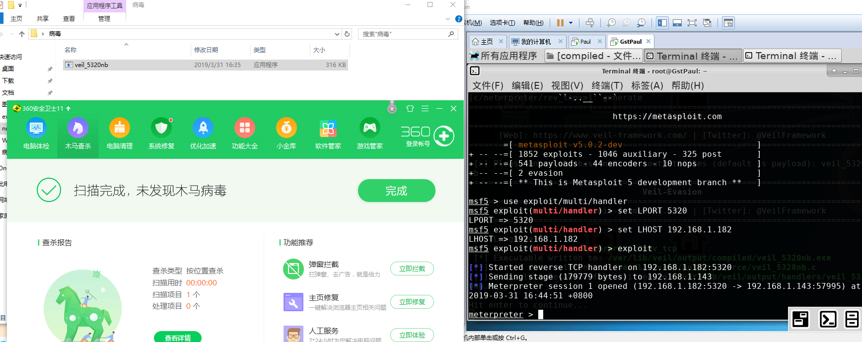 - 这一次的实验让我明白了杀软并没有什么卵用,它能够进行扫描查杀病毒的基础是病毒库,所以只要你能够拿到在它的病毒库里没有记录过的后门程序或者软件,那么就很容易对运行杀软的主机进行攻击,所以以后在使用电脑的过程中,就算装了杀软,也要注意上网过程不要下载一些不安全的软件。还有就是,不同的杀软,扫描查杀病毒的能力也参差不齐,360作为老牌杀软,能力还是不错的,虽然比起国外的付费软件,差距还是有点大,但和国内的相比,还是优势很明显,总而言之,网络攻防,有攻才有防,只要你能想出新的战术,就能破解敌方落后的防御工事。