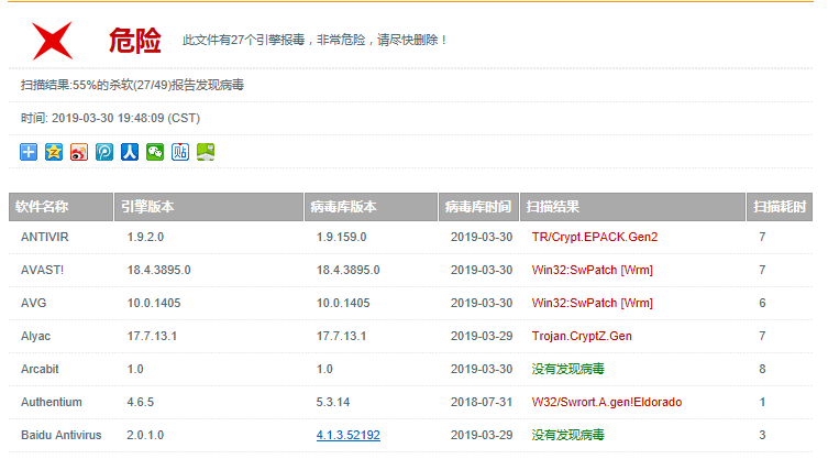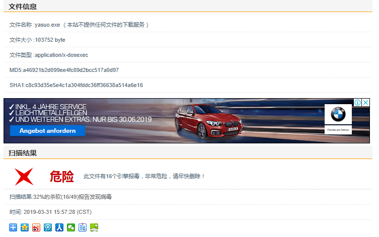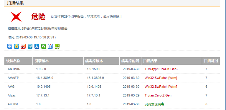 这里我和其它同学一样,使用实验二中msf生成的简单后门程序放到virscan网站中进行扫描(文件名还不能开头为数字),发现这个未经处理的后门不堪重任。