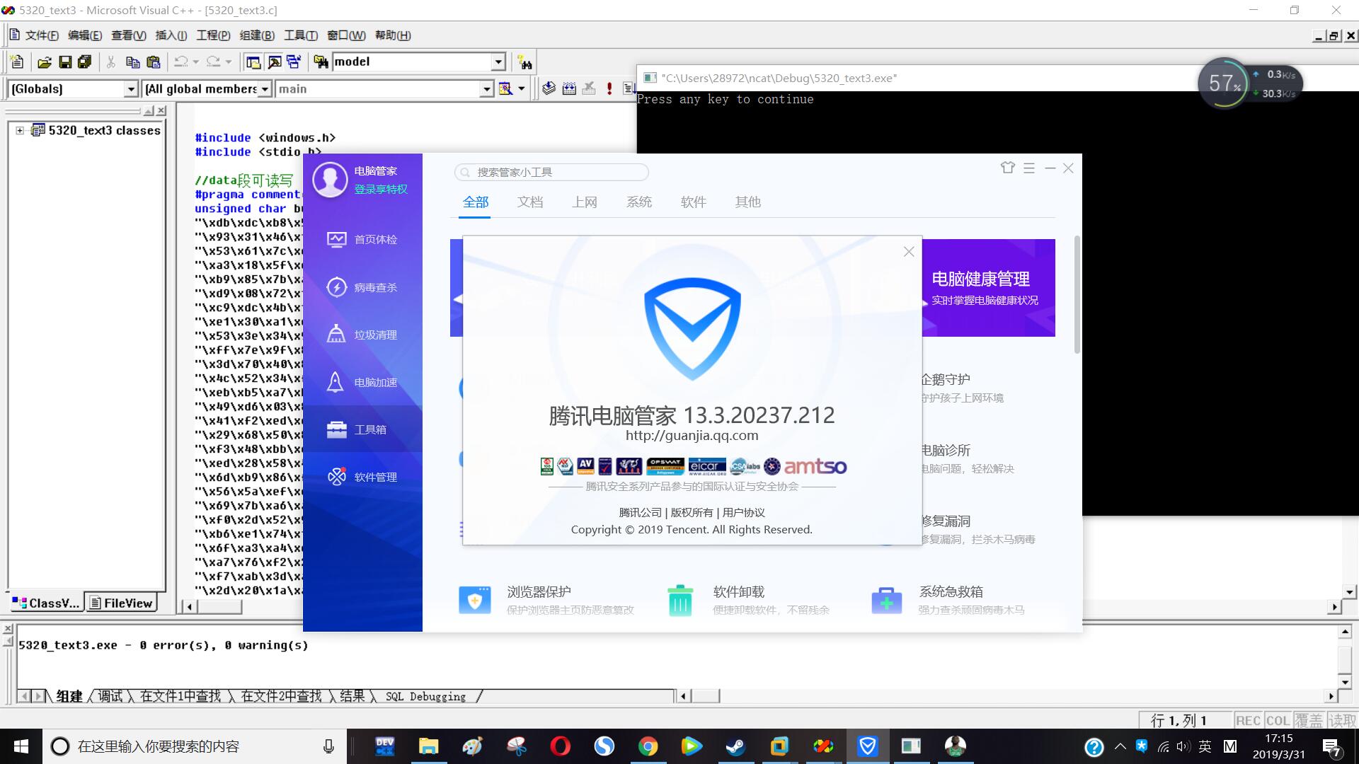 - 还是按照上面免杀的方法,将我生成的一段shellcode,发送给我的好室友,我的好室友使用VC编译运行,在杀软运行的情况下,回连成功,截图与杀软版本号如下: