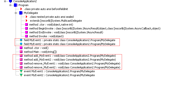 一个事件的声明是可以转化为一个代理字段的声明加上添加、删除两种方法的事件操作。上面的MyEvent事件与MyEvent字段、add_MyEvent方法、remove_MyEvent方法关联起来了。