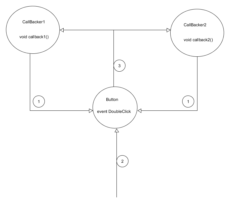 圆圈1,表示第一步:首先把CallBacker1的callback1()方法和CallBacker2的callbacker2()方法注册到Button的DoubleClick事件中。
