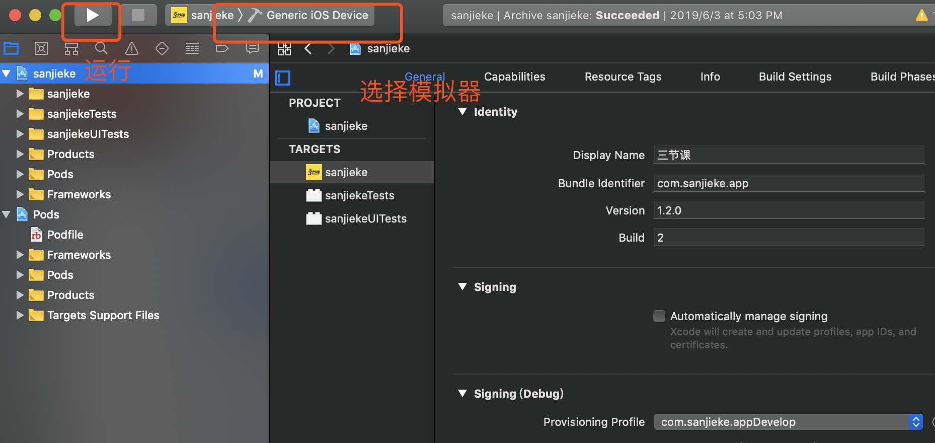 如果只是模拟器运行是不需要配置证书描述文件的,选择模拟器类型,直接运行就好了。