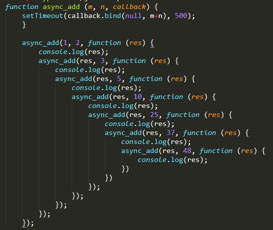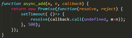 首先 await 关键字后面是跟一个promise的函数,他的返回值就是promise resolve 或者reject 的值。 所以首先要async_add 改成promise的函数, 这里可以用上文中ES6 中 的Promise构造函数, Promise 构造函数 接受的就是执行异步的代码,直接把settimeout 异步函数包起来就可以了。又因为,await 等待的是promise resolve的结果,所以把callback.bind 改成了callback.call,直接调用函数。整个async_add 函数修改如下: