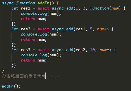 现在再声明一个async 函数,因为await 只有在async 函数中使用,在里面使用async_add 函数的时候,一定要让callback 返回值,它的返回值就是await 等待的值。 一个简单的调用如下。