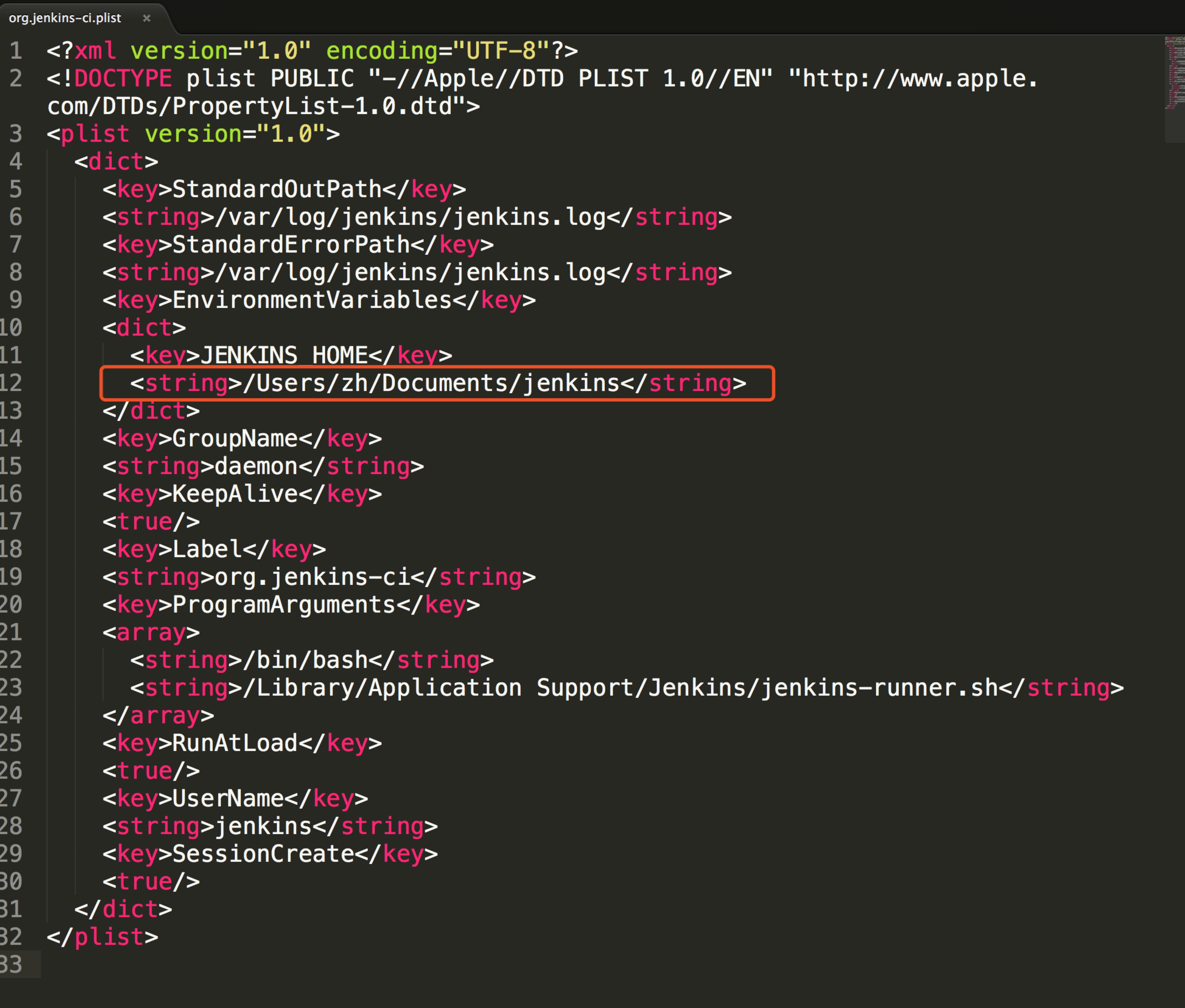 用 sublime打开 org.jenkins-ci.plist文件 。打开之后是下面这个样子 。