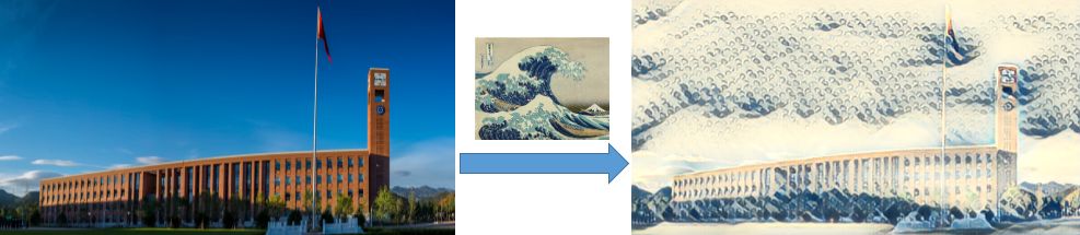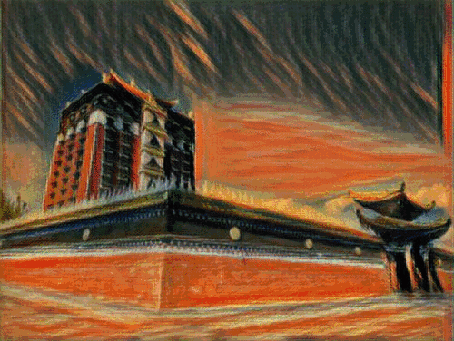 上图是老王在甘南合作的米拉日巴佛阁外面拍下的一张照片,采用风格迁移技术后的效果为: