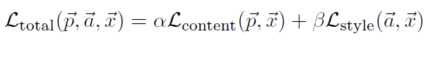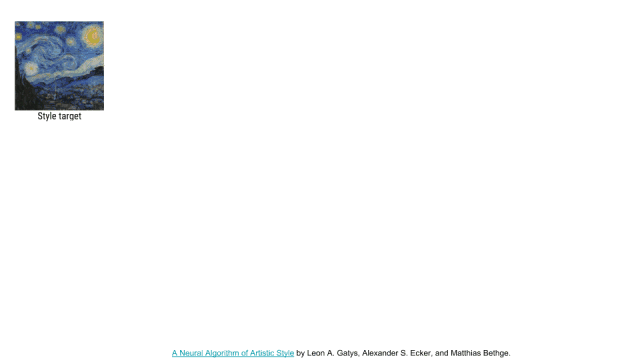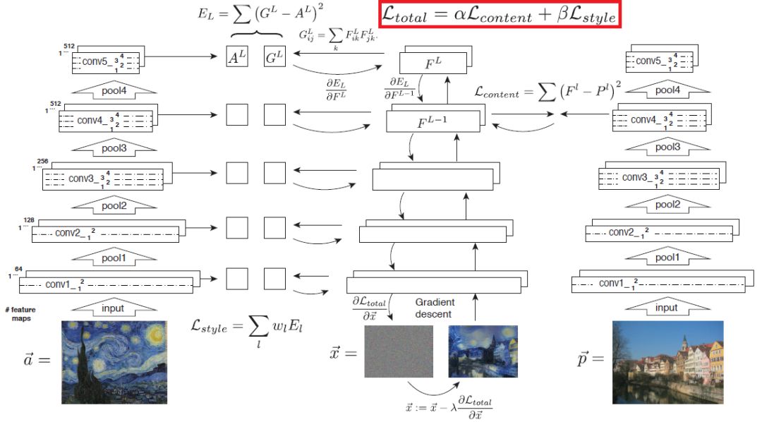 为了将内容图片和风格图片融合在一起(见下图),我们应该使风格化结果图(初始为一张白噪声图片)的特征同时与内容图片和风格图片的特征之间的距离最小化,最终获取我们所需的风格化结果图。