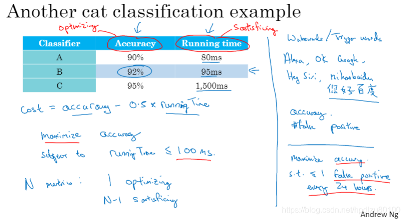 评价指标可分为两类:优化指标(optimizing metrices)和满足指标(satisfying metrices)。优化指标需要重点关注,满足指标相当于约束条件而不得不考虑。