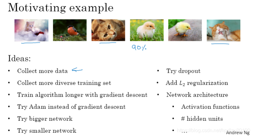 问题引入:如何提高机器学习的水平?可能有很多种想法(如,收集更多数据、收集更丰富多样的训练数据、增加梯度下降法迭代次数、增加网络规模、减小网络规模、使用随机失活(dropout)、添加L2正则化项、改变网络架构(激活函数、隐层单元数等)),应该选择哪些,舍弃哪些?