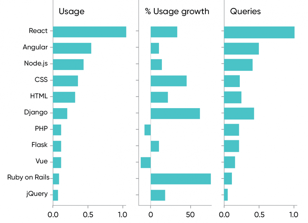 如上图所示,React 在使用量上处于领先地位,同时呈现 34%的显着增长。尽管有传言称 Angular 正在逐渐消失,但它依然是排名第二的平台,增长了 10%。服务器端平台 Node.js 的内容使用量仅次于 Angular,增长了 15%,这些都还比较合理。