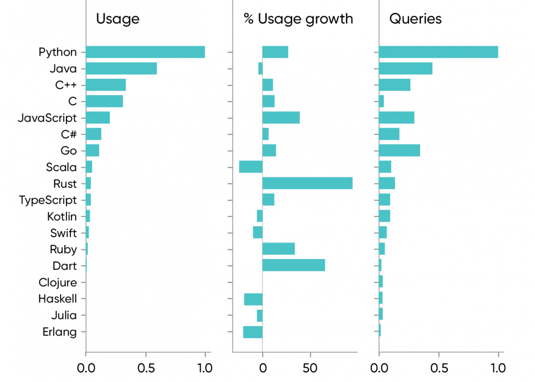令人惊讶的是,JavaScript 的使用量远远落后于 Python 和 Java,仅仅是 Python 的 20% 和 Java 的 33%。再往后看,我们发现 Go 语言和 Rust 语言也在以 16%和 94% 的速率持续增长。