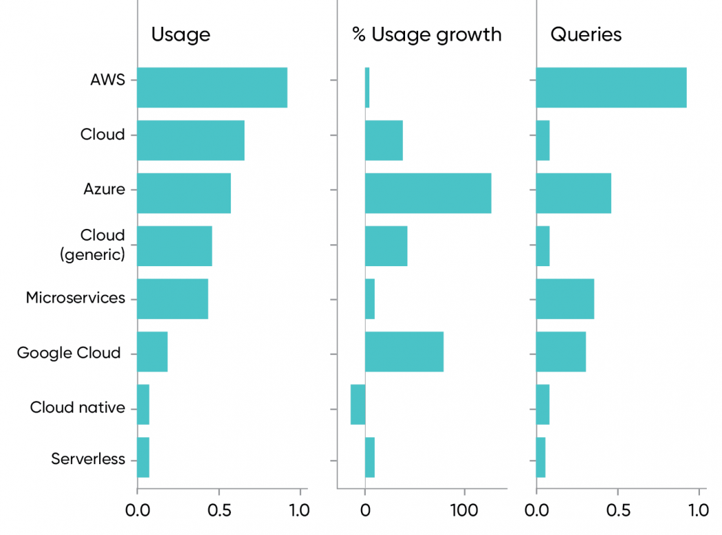 云服务在迅速增长已经不是什么新鲜事了。自去年以来,云的关键词使用量增长了 41%,这还不包含特定供应商例如 Amazon Web Services、Microsoft Azure 或 Google Cloud,如果加上这些,增长率高达 46%。