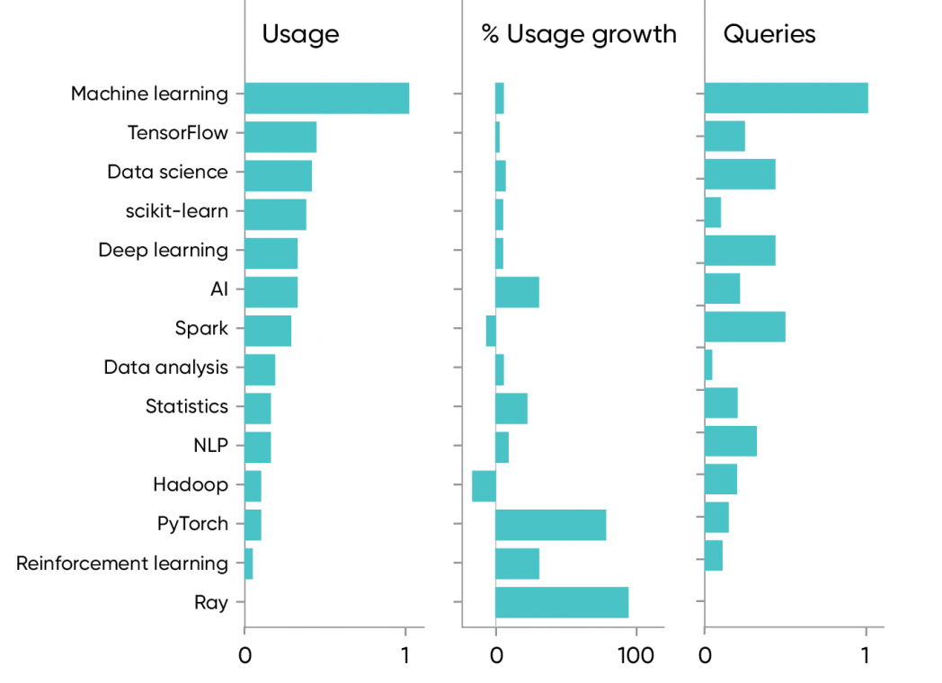 尽管 AI 和机器学习是两个截然不同的概念,但它们经常被混淆,于是我们将机器学习定义为「AI 的有效部分」。AI 更注重科研和前瞻性,机器学习是将 AI 从实验室中带出来并付诸实践的技术。如果你理解了这个定义,那么有关机器学习的内容占使用量第一就很正常了: