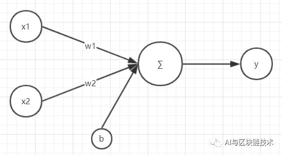 我们以最简单的神经网络单层感知机为例讲解一下,单层感知机只有输入层和输出层。下图是一个只有2个输入单元和1个输出单元的简单单层感知机。图中x1、x2代表神经网络的输入神经元,w1、w2代表输入神经元的权重,b代表输偏置量,y为输出神经元的输出。则,我们的输出就是: