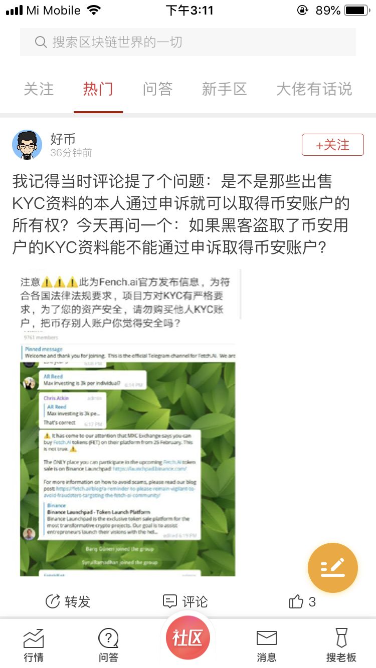 用户“好币”对于币安的安全系统提出质疑,如果KYC的信息被盗,那么用户完全可以通过申诉获取该账户的所有权,那么真正拥有该账户的用户将蒙受巨大的损失。