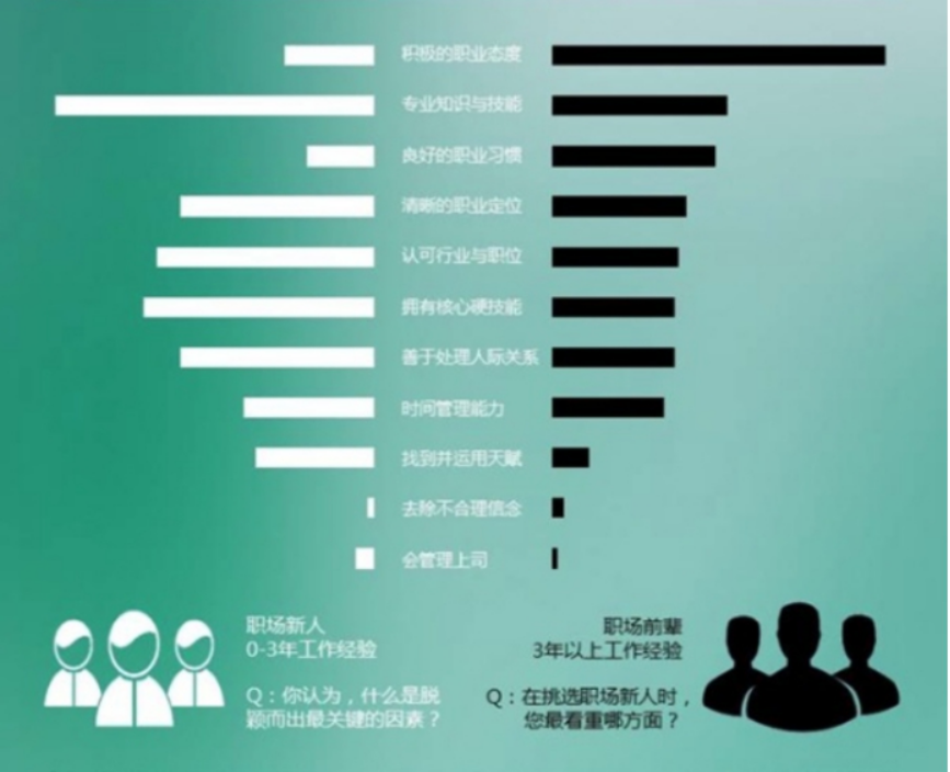 左边白色部分是职场新人,在他们的选择里站前三名的分别是: 第一名: 专业知识与技能,第二名:拥有核心硬技能,第三名:认可行业与职位;右边黑色部分是职场前辈的,前三名的选择分别为: 第一名:积极的职业态度,第二名:专业的知识和技能,第三名:良好的职业习惯。