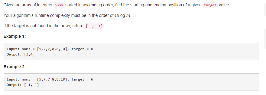时间复杂度为 O(log n),想到用二分法。要求所在下标组合,则需在求得 target时在向前、向后查找 target,直至找到 target 出现的最大、最小下标。