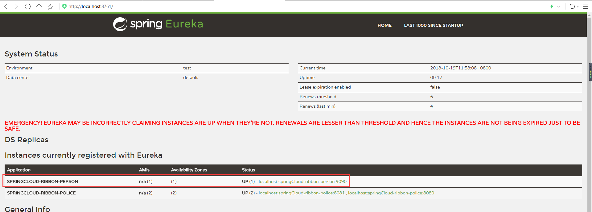 如下图,出现了两个服务实例,分别是:8080、8081,红色的信息咱们先不管他,如果实在有看着不顺眼的小伙伴,可以配置心跳(简单的来说,就是配置服务器每隔多久检查一次服务实例状态,如果某个服务因为某些原因停掉 不能用了,那么就将该服务 从服务列表中移除掉)