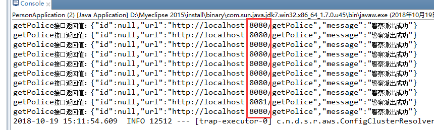上面是默认的轮询规则,8080、8081轮询去访问服务,,,那么下面说一下如何自定义规则,在上一章的 “Ribbon 负载均衡机制(自定义负载均衡规则)” 中有贴过自定义负载均衡的自定义规则类,在这里就不再重复的贴了,大家可以到文章中去看一下。