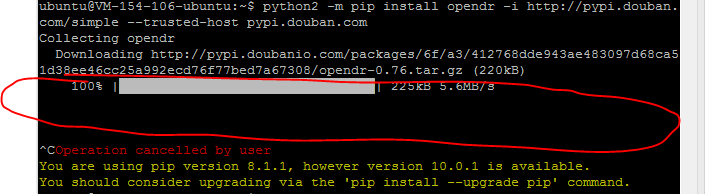 使用豆瓣的源(已经确认过了该源中有opendr包),pip安装opendr,结果卡在了下载完成的位置,什么提示也没有。(如下图)