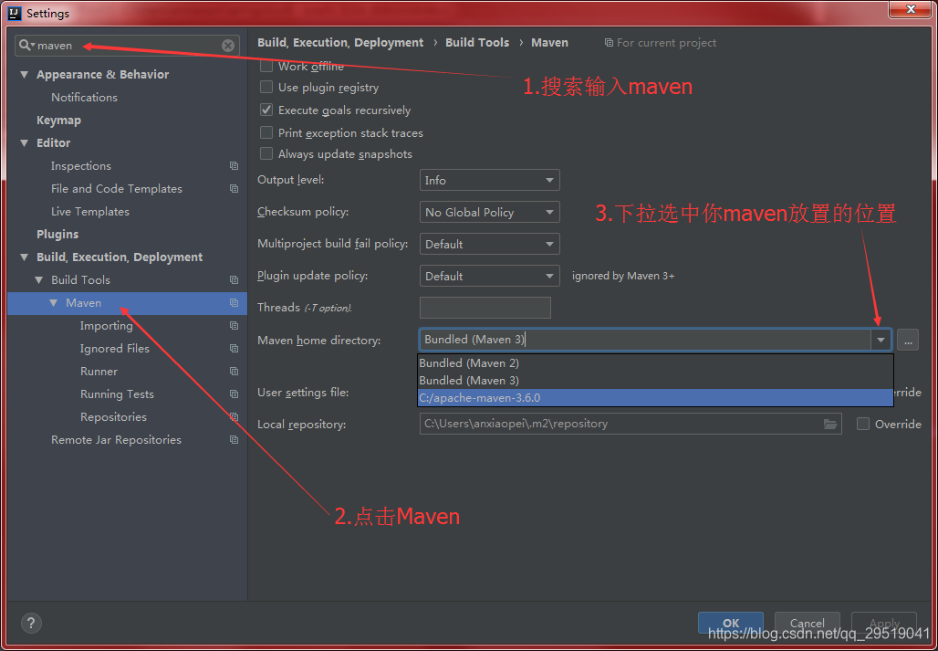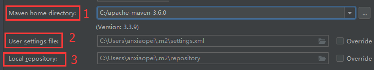 因为我之前做过配置,因此只需要改变框1的路径,如第一次配置需要自己找到你maven放置的位置,以及settings.xml,repository的位置,实在不会的百度 maven集成idea