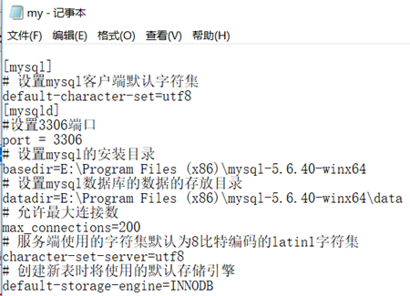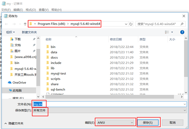 (3)在安装目录下新建文本,点击进去配置相关的参数,点文件另存为,文件名为my.ini,保存类型所有文件,编码ANSI,保存到安装目录下,并将其my.ini复制到