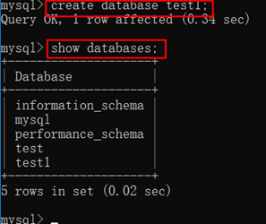 测试下能不能创建表,输入create database test1;回车 show databases;回车 查看是否存在表test1,有则成功