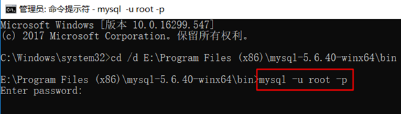 目录下,输入mysql -u root -p 回车 即可访问数据库(此时密码为空)