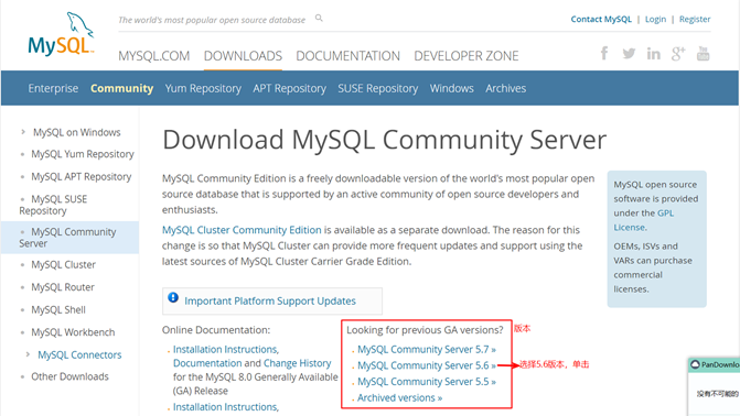 (1)打开https://dev.mysql.com/downloads/mysql/,下拉,根据个人需求选择合适的版本,我的是Windows10 64位此次选择5.6版本