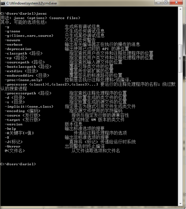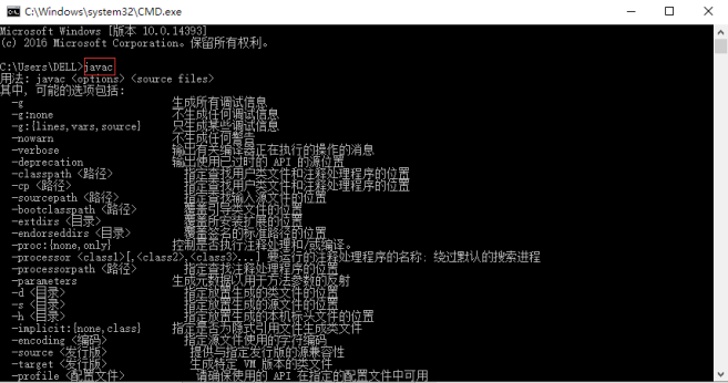 到这里,就已经配置完成了,接下来可以打开DOS命令(开始菜单右键,运行:CMD)输入javac,显示如下图一样就可以了。