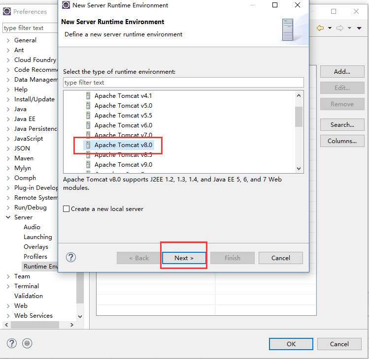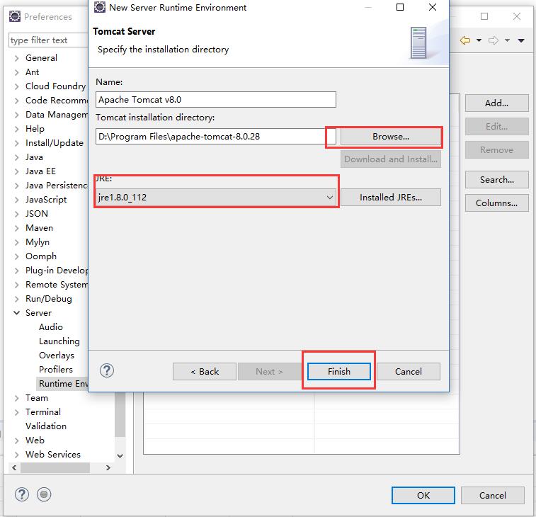 然后选择对应的Tomcat版本,选择之前的Tomcat安装目录就行了。如下图所示,这里用的是Tomcat 8.0版本的服务器。选择了Tomcat目录之后下面还可以选择JRE版本,本机之前装了JDK8了。所以下拉选择一下,不用workbench自带的了。毕竟JDK8和Tomcat8更般配。哈哈哈哈。最后选择Finish。那么服务器环境就搭建好了。