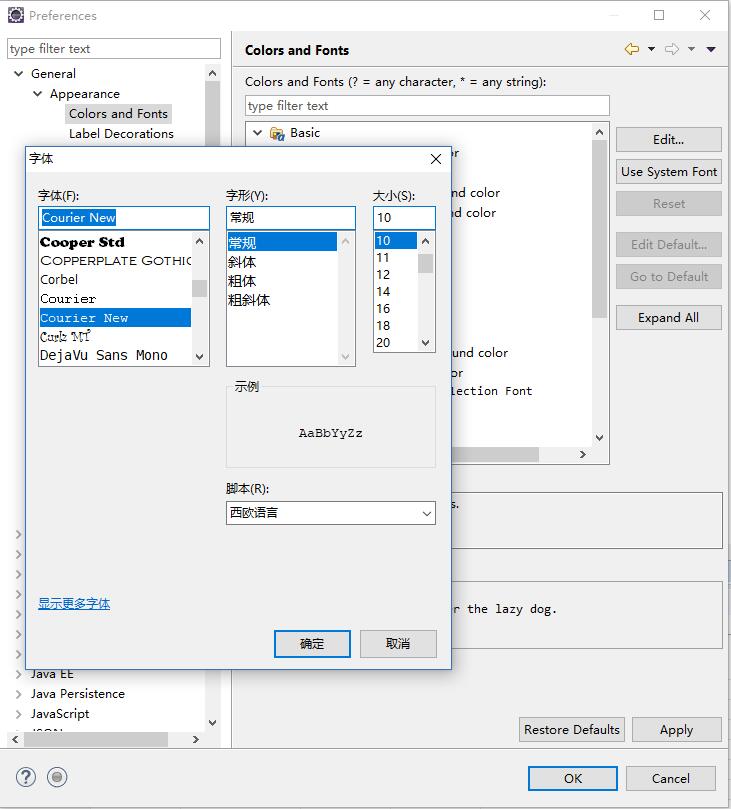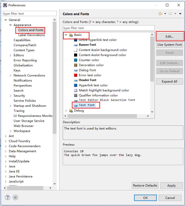 这一步骤的原因是Eclipse默认的字体非常难看,代码看起来很难受。所以设置一下,便于阅读。依次打开 Window - Preferences - General - Appearance - Colors and Fonts,然后在界面右侧选择 Colors and Fonts里面的 Basic - Text Fonts - Edit。一般我们把字体改成 Courier New就行了。如下图所示。