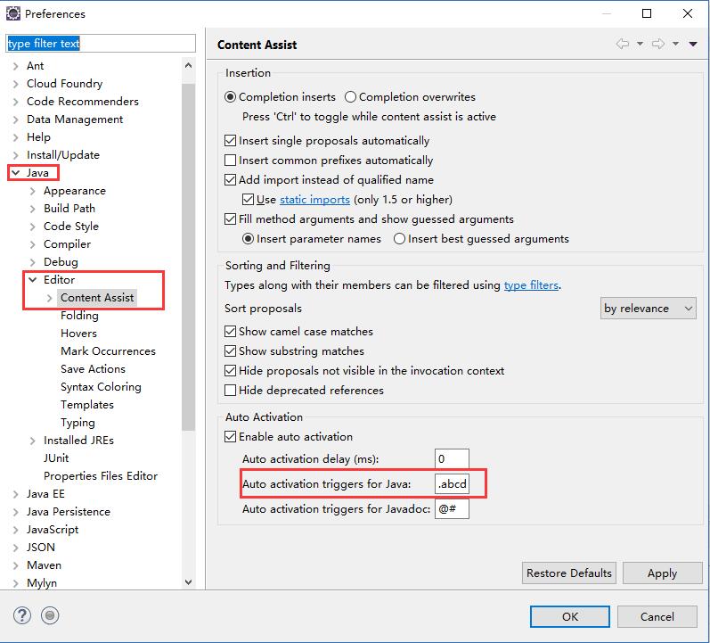 Eclipse代码的提示需要是打出英文句号“.”后才触发,这种情况对于写public private等关键词或者变量的时候非常麻烦,你必须自己写出完整的单词才行。这是非常影响效率的。这一点Intellij Idea做的非常好,自动提示简直完美。所以这里,我们设置一下。依次点击 Window - Preferences - Java - Editor - Content Assit,勾选 Enable Auto Acitivation,并将在 Auto Acitivation trigger for Java那里的框中的点改成.abcdefghijklmnopqrstuvwxyzABCDEFGHIJKLMNOPQRSTUVWXYZ(,这个,然后就有自动提示了。