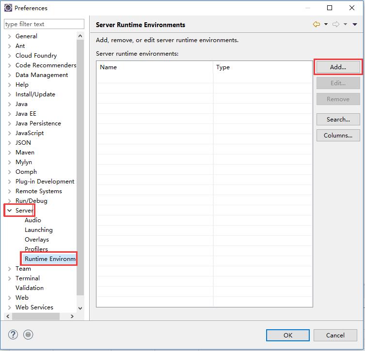 Eclipse没有自带服务器环境,我们这里需要自己配置一下。刚才已经说了,假设你的tomcat已经下载解压了。然后在Eclipse菜单栏依次点击 Window - Preferences - Server - Runtime Environment - Add,如下图所示