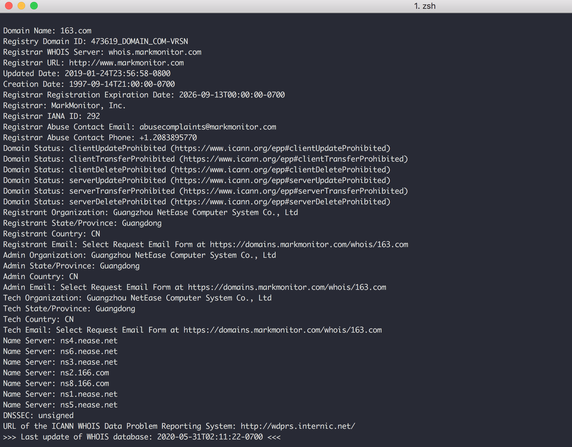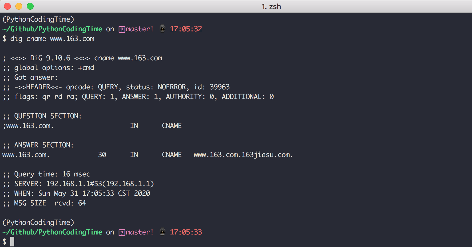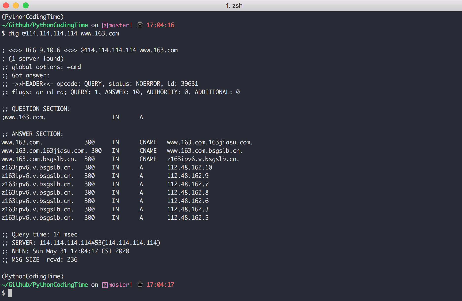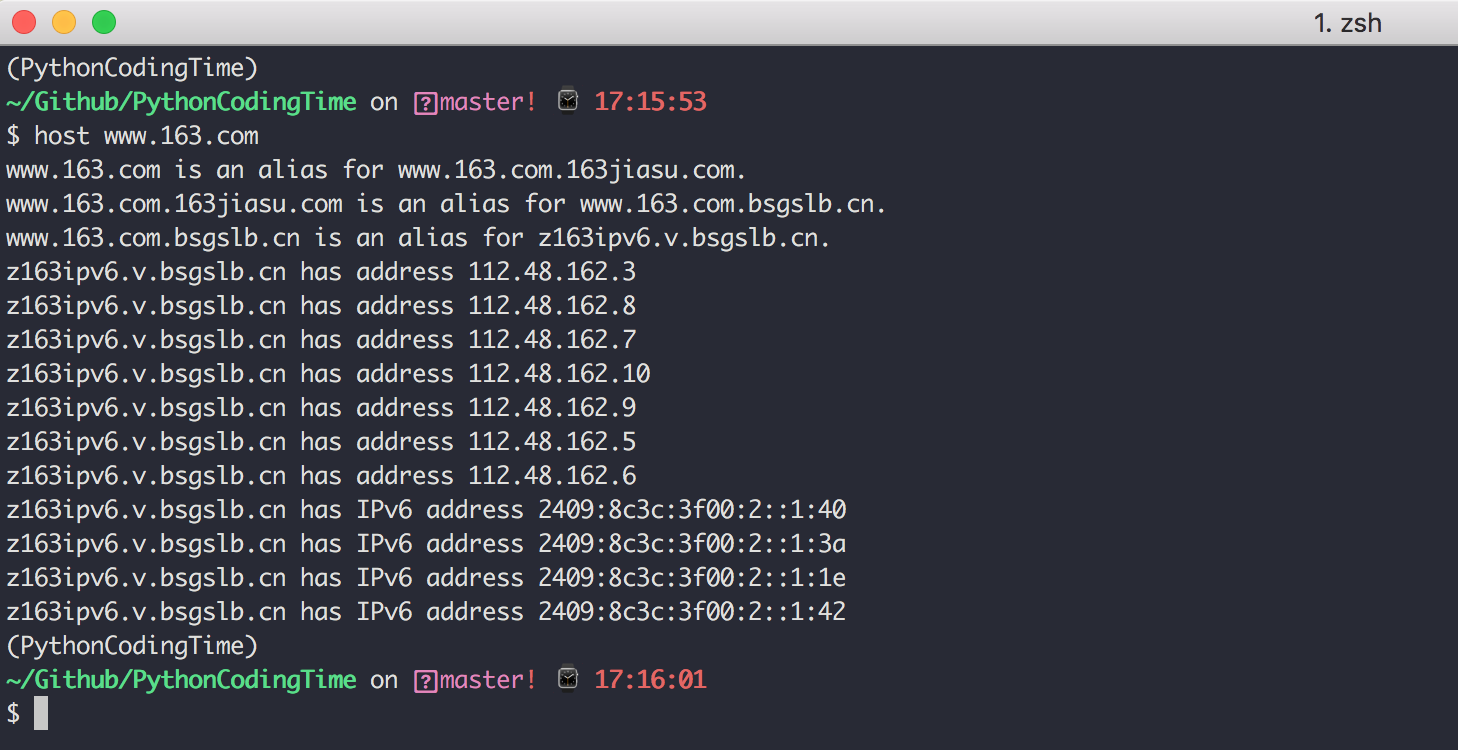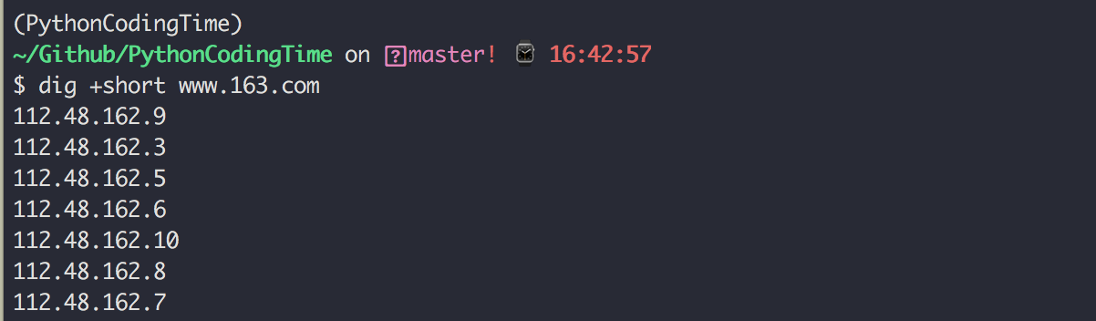 如果你只想看到结果,可以使用 +short 参数,可以直接返回 www.163.com 对应着哪几个ip