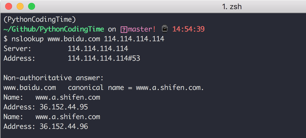 你也可以指定公网的域名服务器进行查询,比如常见的 114.114.114.114